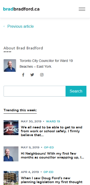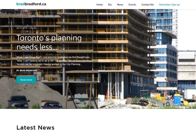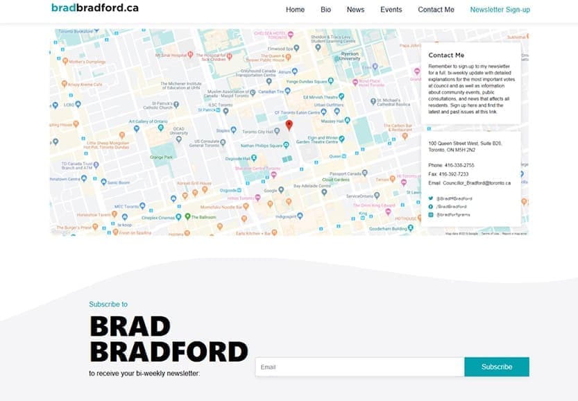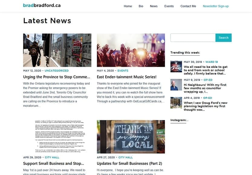 Given the requirements, WordPress was an obvious choice for the project. A leading content management platform today, WordPress allows the creation of complex websites with robust functionality at a fraction of the cost of a custom website build. For Councillor Bradford’s website, we used a proprietory web template developed by Concise Studio that we customized to the project’s needs.